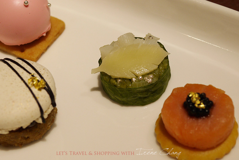拉近給大家看看這些精緻的鹹點:迷你壽司、金箔魚子醬鮭魚餅乾。