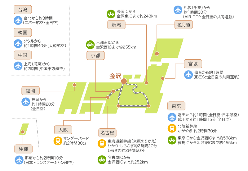 小松空港是軍民共用的小型機場,出境所需的時間相對減少,從小松空港到金澤市大約是半小時至一小時的車程。