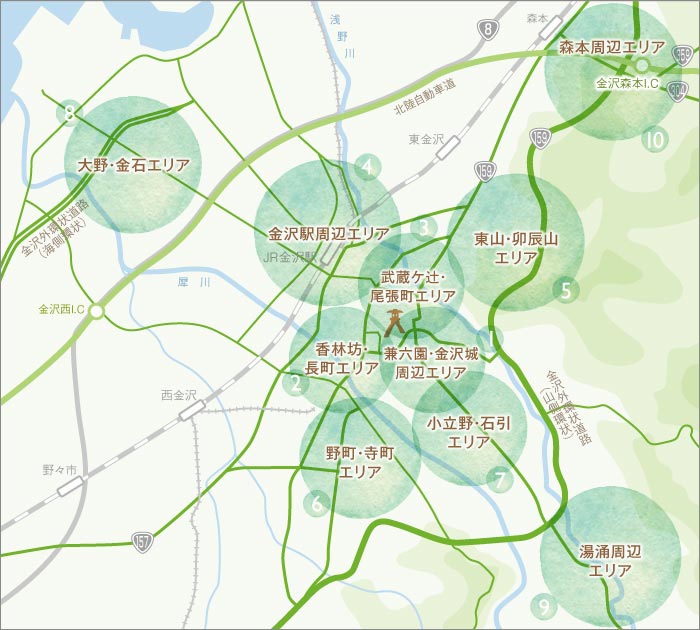 日本方面直接分成十個周邊:「兼六園・金澤城」、「香林坊・長町」、「武蔵ヶ辻・尾張町」、「金澤站」、「東山・卯辰山」、「野町・寺町」、「小立野・石引」、「大野・金石」、「湯涌」、「森本」。